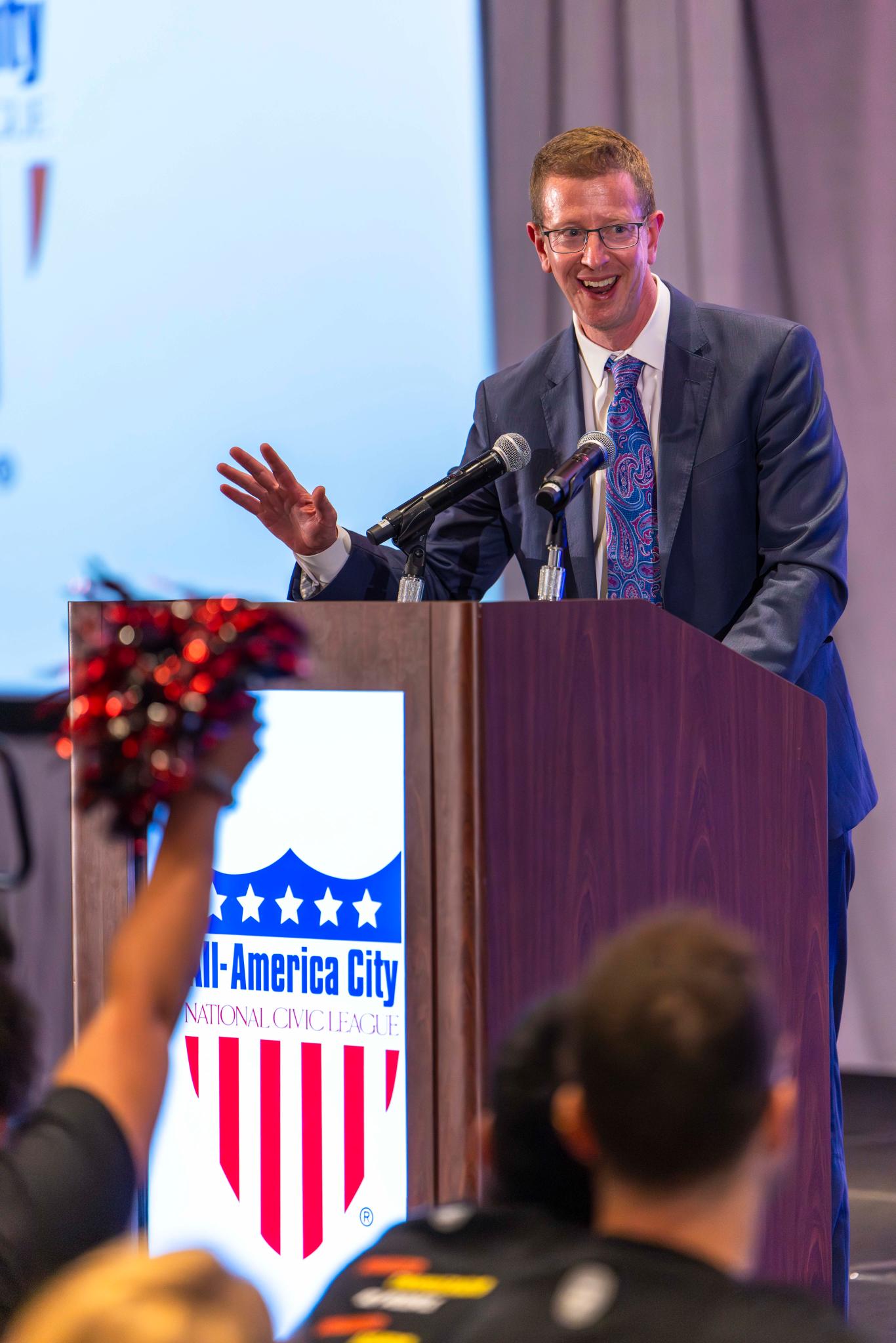 “The All-America City Awards brought together an incredible group of local leaders who are finding creative ways to expand opportunity and build stronger communities. These changemakers are showing us what democracy looks like when it works from the ground up. It’s inspiring, and I look forward to following their progress and cheering them on.” – Derek Kilmer, Senior Vice President of US Program and Policy for The Rockefeller Foundation, during his keynote remarks at the 2025 All-America City Award Event.