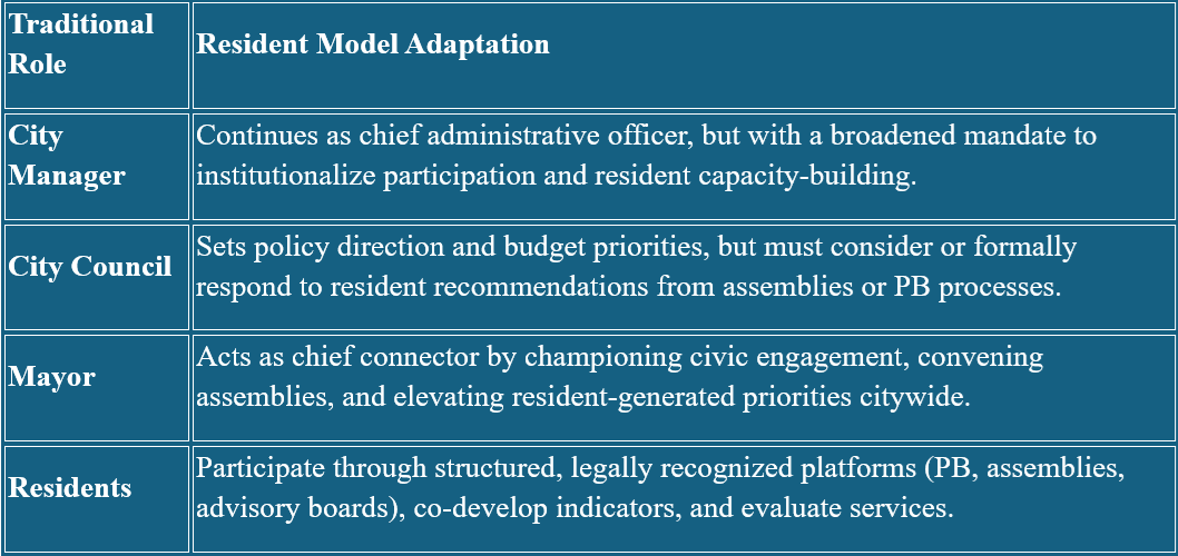 - Resident Engagement Director (within City Manager’s office): coordinates or supports participatory processes and ensures outcomes integrate into policy cycles.