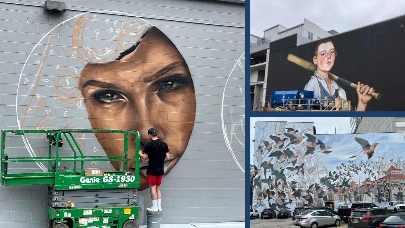 In Pittsburgh, iconic Rosie the Riveter keeps an eye on the street below from her wall mural. Students in New Orleans created wall mural art at the site of a Hurricane Katrina levee breach, two decades after the tragedy.